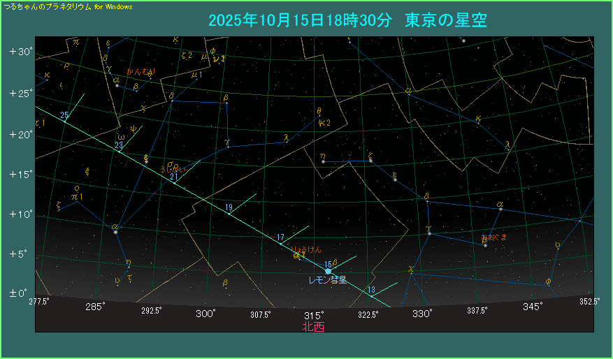 暗夜でレモン彗星を観測することを考えた場合、夕方にそろそろ見え始めるのが10月15日ごろです。星図のように東京で18時30分の場合だと、5度という低い位置に見えます。明るさは4.9等ですから、郊外なら双眼鏡を使えば楽に見えます。今日は下弦の翌日で月明かりがありません。観測するにはもってこいの日がしばらく続きます。