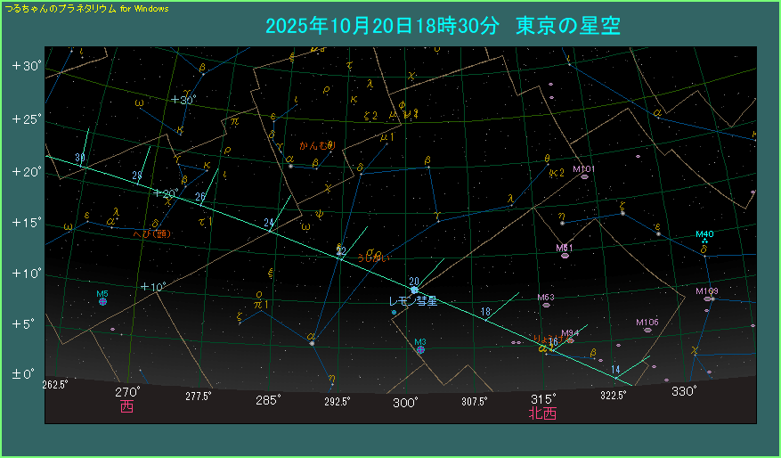 翌日の同じ時間、レモン彗星はりょうけん座α星の右側で、0.9度まで接近しています。見つけるのに狙い目ですので、10月16日もぜひご覧になってください。