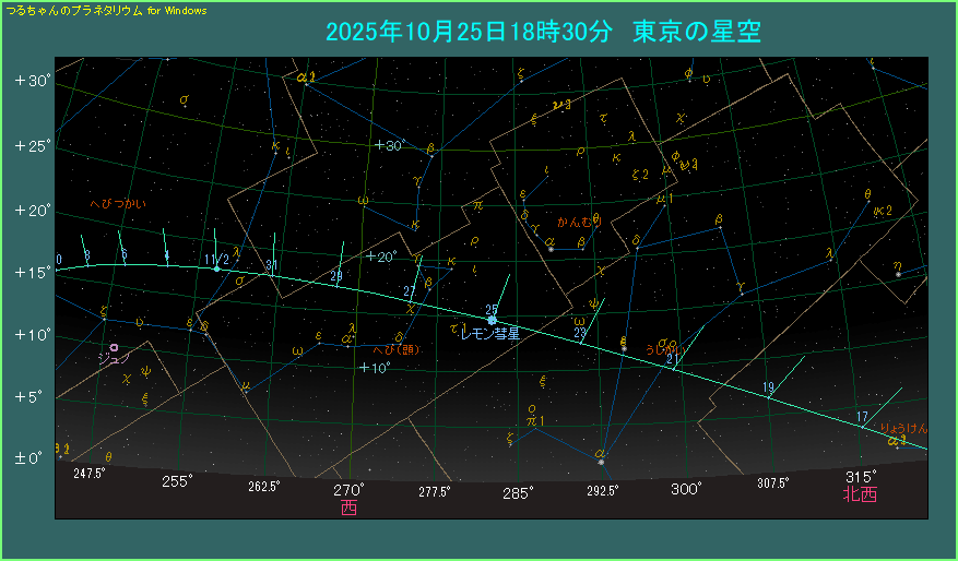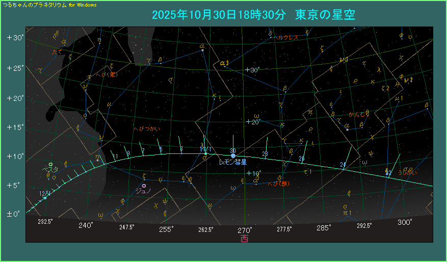 今日のレモン彗星はほぼ真西に見えます。しかし付近に明るい星が見当たりません。最も近いのはへびつかい座α星(2.1等)ですが、21.2度も離れています。かんむり座α星(2.2等)も同じようなもので、22.5度です。