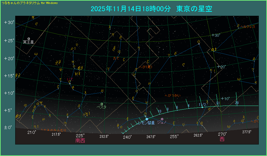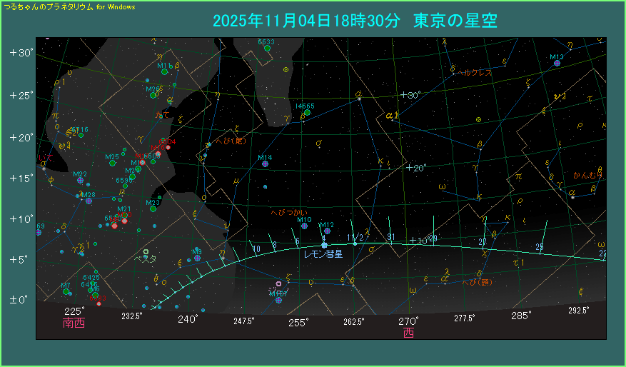 今日はへびつかい座が作る五角形の左下の星、η星(2.4等)のすぐ右下に見えます。1.1度の至近距離ですから、η星さえ見つかれば、レモン彗星を双眼鏡でとらえるのは簡単です。去りゆくレモン彗星を見送りましょう。