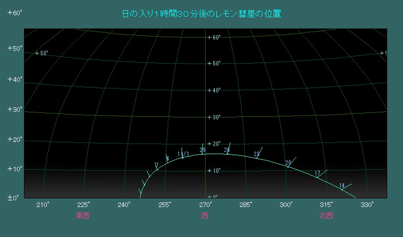 レモン彗星を見るオススメは、日没後の西空です。下の図は東京で日の入りから1時間30分が経過したときに、どの位置に見えるかを3日間隔でプロットしたものです。この時間帯はちょうど空が完全に暗くなった頃で、彗星観測に最適です。