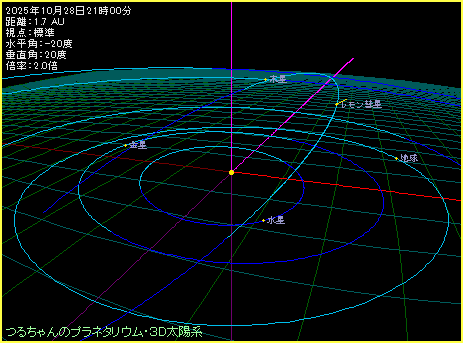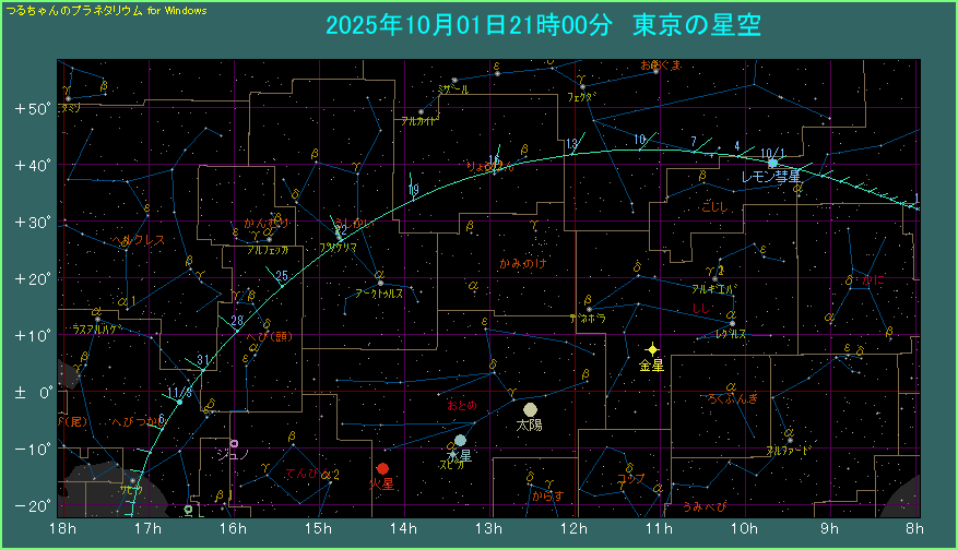 | このページのシミュレーション画像は、Windowsパソコン用の自作ソフト「つるちゃんのプラネタリウム シェア版」を使用しています。無料のフリー版を使っても、このペーシのようなシミュレーション画像を表示することができます。2025年レモン彗星のデータ設定方法より、ソフトのインストールとデータ設定を行ってください。 ※計算精度の関係で位置が多少ズレることがあります。ご了承ください。 |