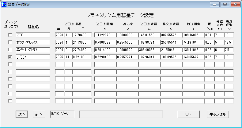 左下にある[次へ]ボタンを何度か押して空白行を表示し、下の画像ようにレモン彗星のデータを入力します。全て入力したら左端にチェックを入れて[OK]ボタンを押せば、設定完了です。