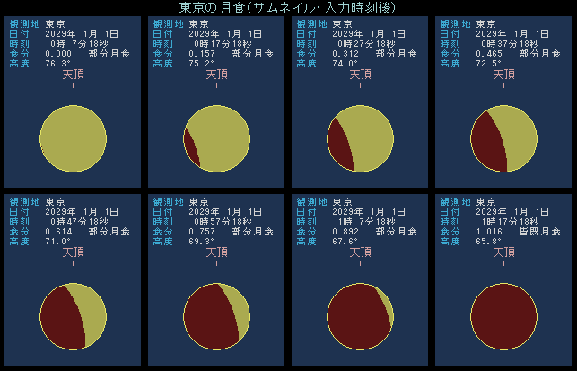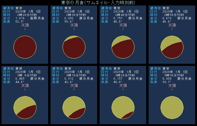 次回は2029年12月21日に皆既月食が起こりますが、日本では多くの地域で、皆既になる前に月没を迎えます。