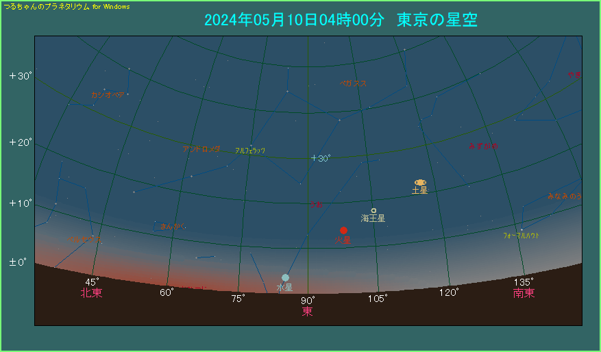 朝の4時ごろ、東の低空に水星が現れます。東京でこの時間帯は日の出が40分後に控えています。それにもかかわらず高度は3.6度しかありません。薄明が強い状態で0.5等の水星を肉眼で見つけるのは大変かもしれません。双眼鏡が必要と思っておかれた方が良いでしょう。
