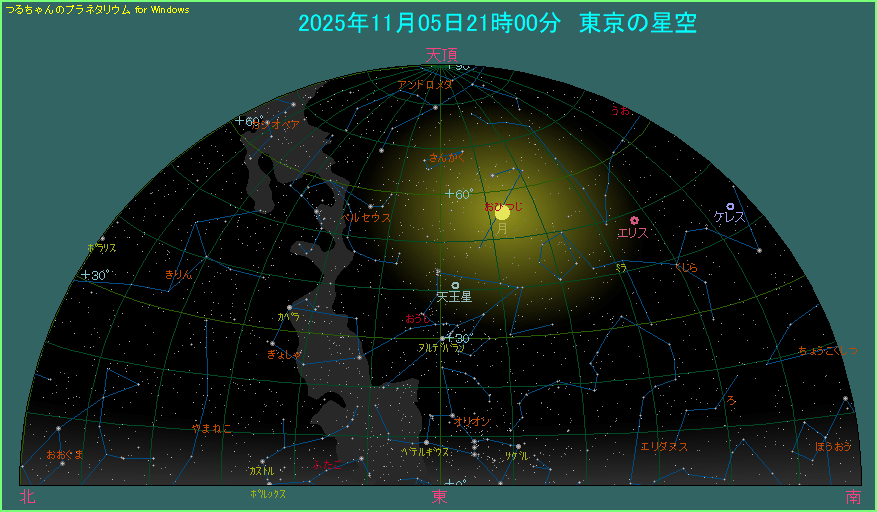 地球が自転しているため、東京から月が最も大きく見えるのは月が南中する頃で、11月5日の23時から24時ごろとなります。
