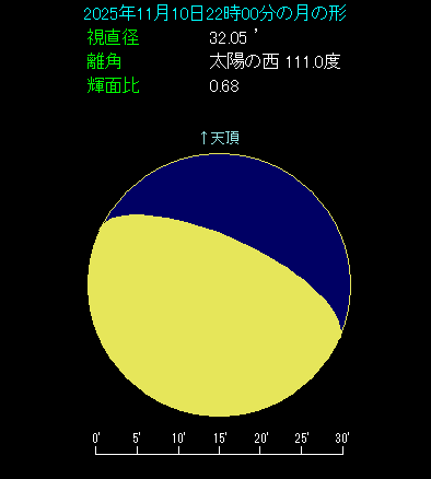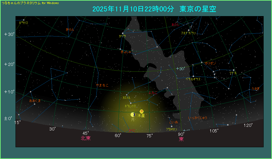 2025年11月10日に月が木星に近づきます。 22時ごろに東北東の低い位置を見ると、2日後が下弦という、月齢20の丸みを帯びた月があります。木星は月の右側やや上方向にあり、間隔は4.6度です。ふたご座のポルックスも月の上側にあり、5.7度という比較的近い位置です。