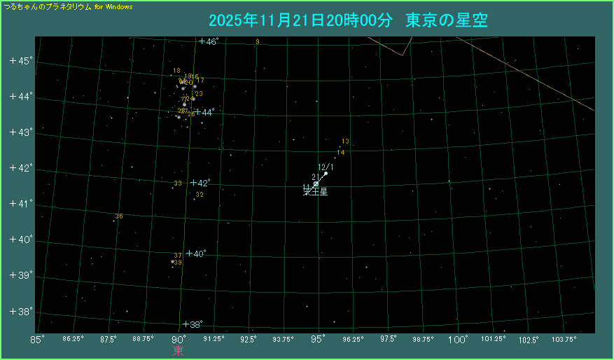 場所はおうし座のプレアデス星団からそう遠くない所です。幸い前日が新月ということで、この日は月明かりがありません。20時ごろに東の方角を見上げ、星図を頼りに探して見られてはいかがでしょうか。