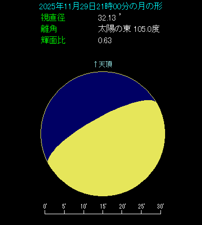 今月は2日に続いて29日も、月と土星が並びます。 21時ごろに南西の方角を向いて空の中ほどを見ると、半月過ぎの丸みを帯びた月が見えます。月の左側に土星があり、0.8等の明るさです。