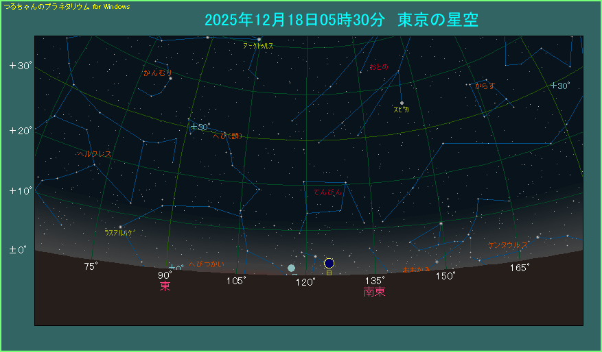 時間がたつと高度が上がって見やすくなりますが、その分だけ太陽が地平線に近づいて薄明が進みます。ほどよいタイミングでご覧ください。