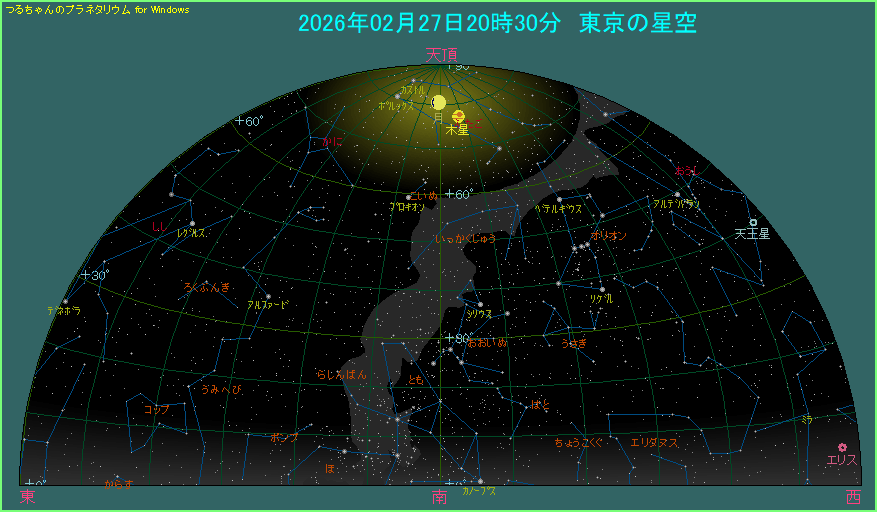東京で20時30分ごろ、真南の方角を大きく見上げてください。天頂に近い所に丸みを帯びた月が見えます。高度は80.5度と、80度を超えています。月の高度が80度を超えるのがそれほどレアな事とは思いませんが、今回は80度にこだわりましたので、星図の時刻をよく使う21時から30分早めました。