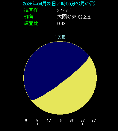 21時ごろに西の空の中ほどに、上弦の前日という、半月に近い月があります。月の下方で金色に光る星が木星です。両天体の間隔は7.5度も開いており、接近と呼ぶのは苦しい状態です。