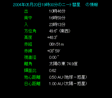 彗星は2004年の5月中旬頃に見頃となりそうです。夕方の西空で彗星が北上するとともに次第に高度を上げていき、月明かりの大きくなる24日頃までが見頃ではないでしょうか。下の絵は月明かりの条件がいい5月20日の日の入り時の様子です。実際にはもう少し時間が経って空が暗くならないと彗星は見えません。絵の左下側に表示されている「空が暗い時間帯」を見るとわかりますように、明石では20時40分に空が完全に暗くなります。