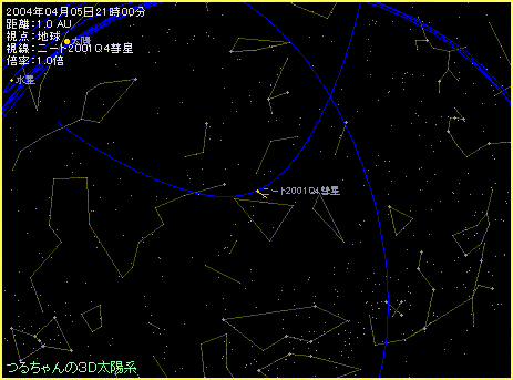 彗星は5月上旬に見やすくなり、南から北へ(下から上へ)と一気に駆け上がっていきます。 ※地球からニート彗星を見た様子です。 ※2004年4月5日から6月7日まで、3日間隔で表示してます。 ※何度も繰り返して表示しています。