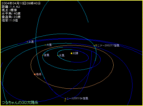 地球は、ニート彗星、リニア彗星の順に接近することがわかります。 ※1.4天文単位から眺めた太陽系の様子です。 ※2004年4月10日から6月18日まで、3日間隔で表示してます。 ※何度も繰り返して表示しています。