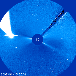 マックノート彗星(C/2006 P1)という彗星が太陽に近づき、太陽観測衛星SOHOのカメラ(LASCO C3)の視野に入ってきました。つまり、それだけ彗星は太陽に近づいているということですね。彗星は太陽へ近づくと明るくなりますが、現在のマックノート彗星の明るさは−2等級から−3等級に達しているようで、これは過去の大彗星に匹敵する明るさです。彗星は現在、日の入り直後の超低空で双眼鏡なら尾も見えるようですが、今後は南半球でしか見ることができなくなります。