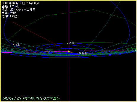 下の絵は「つるちゃんの3D太陽系」のシェア版を使って、ボアッティーニ彗星に乗って太陽系を旅したときのシミュレーションです。彗星は4月上旬から次第に太陽系へ近づき、6月に太陽に最も接近。そして、その後は次第に離れていきます。下の絵では4月はじめから10月にかけて、太陽系へ近づき、そして離れていく様子を1週間間隔で表示しています。どう、カッコイイでしょ?
