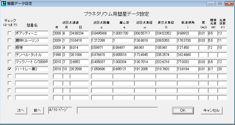[彗星データ設定]画面で、左下にある[次へ]ボタンを何回か押して、空行のあるページを表示します。次に、下のようにハートレー第2彗星の行を追加入力してください。このとき、左端のチェックボックスへチェックを入れるのを忘れないようにしましょう。入力完了後[OK]ボタンを押すと、データ登録は完了です。