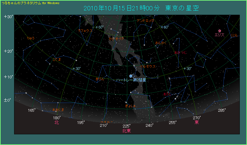 [OK]ボタンを押すと、下のような星図が表示されるはずです。ハートレー第2彗星はペルセウス座付近にあって、北東の空に見えることがわかります。