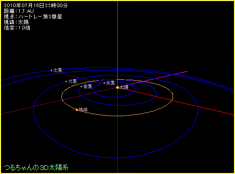ハートレー第2彗星から見た太陽系のアニメーションを見てみましょう。画像は「つるちゃんの3D太陽系 シェア版」を使用しました。視線の方向は太陽に固定し、地球軌道は茶色で示されています。ごちゃごちゃするので土星以遠の惑星は省略しました。アニメーションでは2010年7月中旬から2011年1月末まで、1週間間隔で画像を切り替えています。