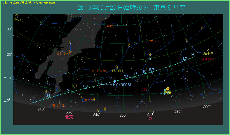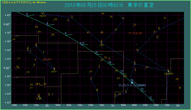 マックノート彗星は星座でいえばアンドロメダ座に位置します。アンドロメダ座α星のアルフェラッツ(2.1等)から地平線方向へたどるのがわかりやすいでしょう。この時間に見ることを想定すると、彗星は日増しに左方向へ移動していき、ジワジワと地平線方向へ高度を下げていきます。反面明るさの方は、7月上旬のピークを目指して明るくなっていきます。
