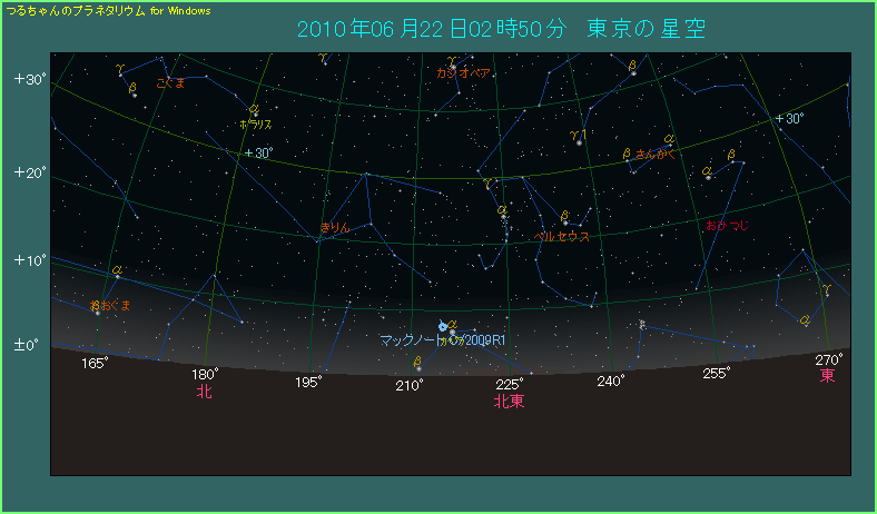 まず6月22日に、ぎょしゃ座の1等星カペラへ1.6度まで接近します。下の星図のように東京2時50分の場合では、カペラは地平線から少し昇ってきたところです。薄明は2時37分から始まりますので、ちょうど空が白み始めたところです。モタモタしていると空がだんだん明るくなってきますから、手際よく探さなければなりません。幸いこの日はマックノート彗星がカペラのすぐ左上に見えます。明るさも5.3等(明るい場合は3.2等)ありますから、双眼鏡を使って落ち着いて探せば、すぐにボーッと光る彗星の姿を見つけることができるはずです。