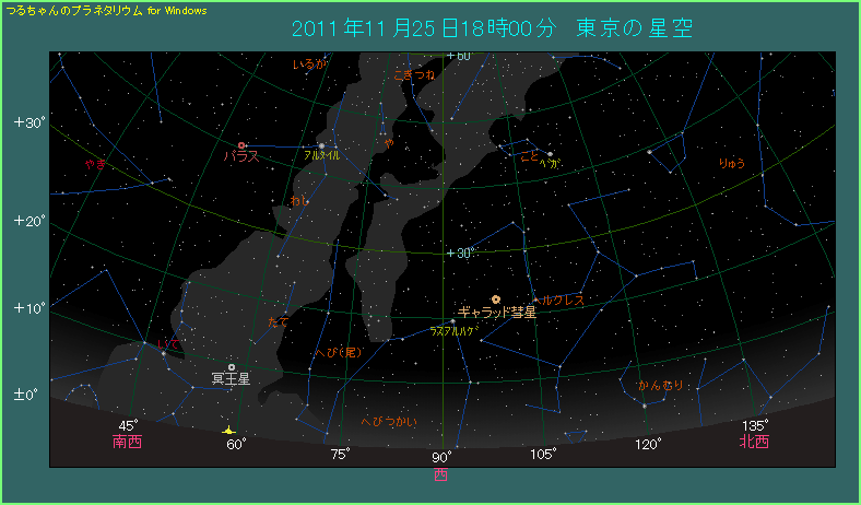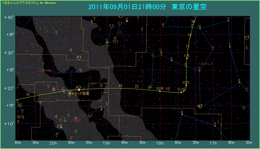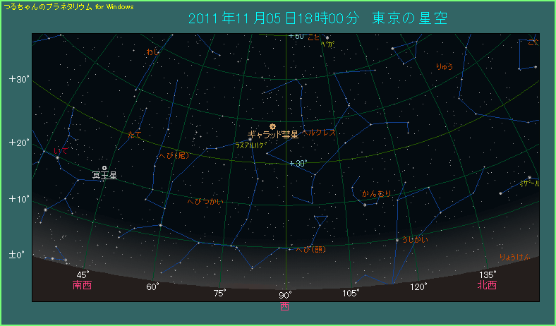 11月のギャラッド彗星は星座に対してほとんど動きません。彗星のあるヘルクレス座は夕方の西空に見えますから、夕方早い時間帯に観測することになります。下の星図は東京で18時に見える位置としています。同じ時刻に観測することを考えた場合、日が経つほど低い位置に見えるようになります。
