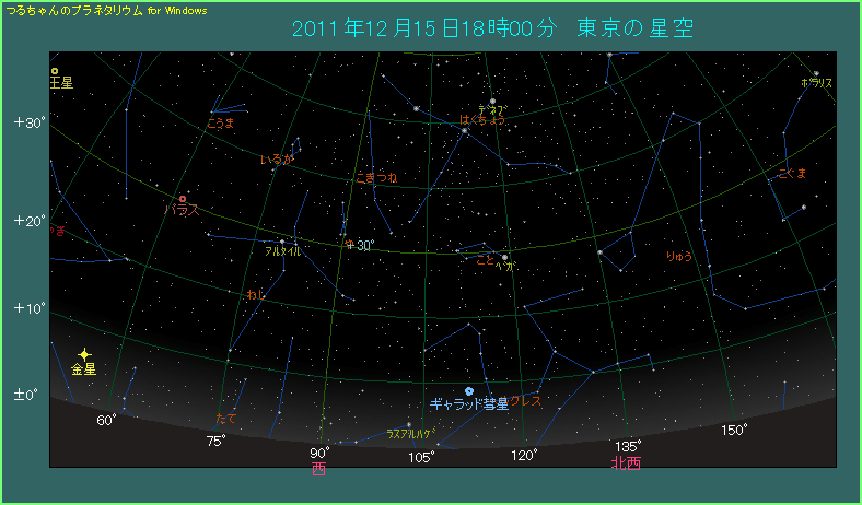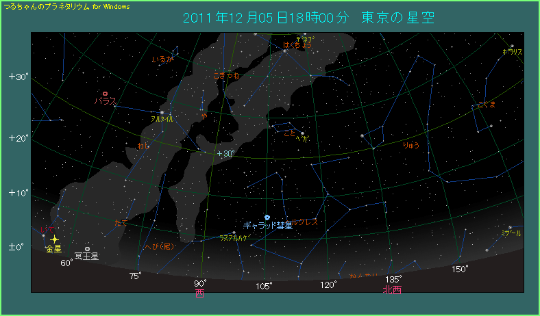 ギャラッド彗星のあるヘルクレス座は、12月に入ると、夕方西空のかなり低い位置にやってきます。このため彗星の観測が次第に難しくなります。12月の中旬以降は夕方よりも、明け方に見たほうが条件が良くなってきます。12月前半の夕方に見られる場合は、半月かそれ以上の太った月がありますから、少なからず月明かりの影響を受けてしまいます。後半の夜明け前に見られる場合は、月明かりの影響が少なくなる21日以降が良いでしょう。