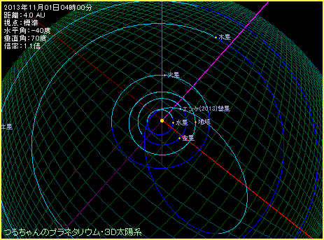 エンケ彗星が回帰した時の観測条件は、かなりバラツキがあります。毎回良い条件で観測できるとは限りません。今回2013年の場合は下の軌道図のように、彗星が地球へ近づくことから明るくなります。しかも、地球軌道面よりも北側にあることを意味する水色部分にエンケ彗星があることから、北半球から見やすい位置にあり、日本からは良い条件で観測することができるのです。