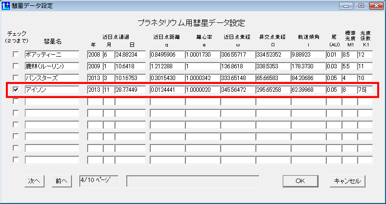 旧バージョンの場合、アイソン彗星データは登録されていません。上記の入力例のように、数値を空行へデータを入力してください。入力後は左端のチェックボックスにチェックを入れるのを忘れないでくださいね。