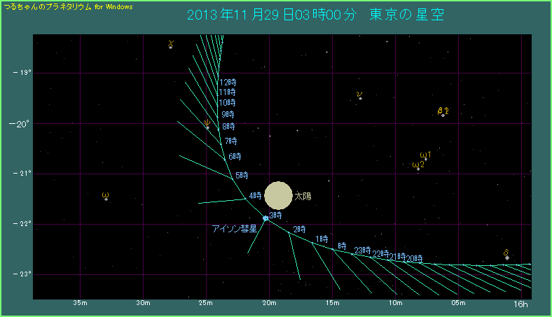 アイソン彗星は太陽の南西側(星図では右下側)から太陽へ近づいてきます。次第に北よりに位置を変えながら、29日3時35分頃に太陽へ最接近します。「星図ではその時刻に太陽へ一番近づいていないじゃないか。」と言われる方がおられるかもしれませんね。これは、三次元的なアイソン彗星の動きで考えると、太陽の右側手前方向から左上側奥の方へ通り抜けていく格好になります。物理的な距離の最接近が、見かけ上の最接近とは一致しないので注意してください。