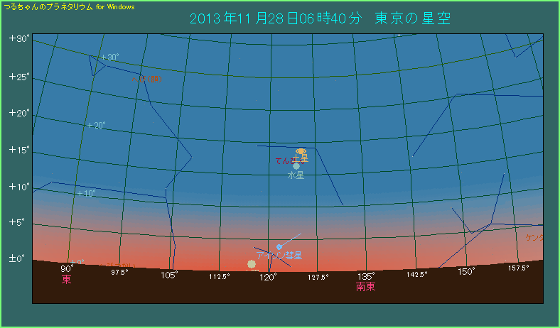 2013年11月28日は、アイソン彗星が近日点通過する前日です。28日0時でも彗星の明るさはすでに-4等台まで明るくなっているはずでしたが、当初よりもだいぶ下方修正されてしまいました。11月28日の場合、見える可能性があるのは夕方よりも夜明け前でしょう。日の出よりも少し前頃から、東南東の空で尾が生えた彗星を観測できるかもしれません。期待し過ぎない程度に期待しましょう!