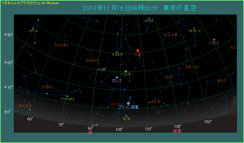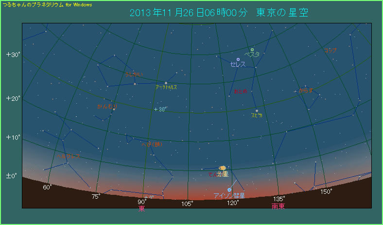 すでに金星軌道よりも内側に入ったアイソン彗星は、明るさを増してきています。この日、予報では6.1等ということで、肉眼でも見える肉眼彗星まであと一息です。残念ながら、まだ肉眼では見えませんので、双眼鏡を使って観測しましょう。夜明け前、東京で4時30分頃ですと、アイソン彗星は東南東の空に見えます。4時49分から空が明るくなり始めますから、あまりのんびりしてられません。
