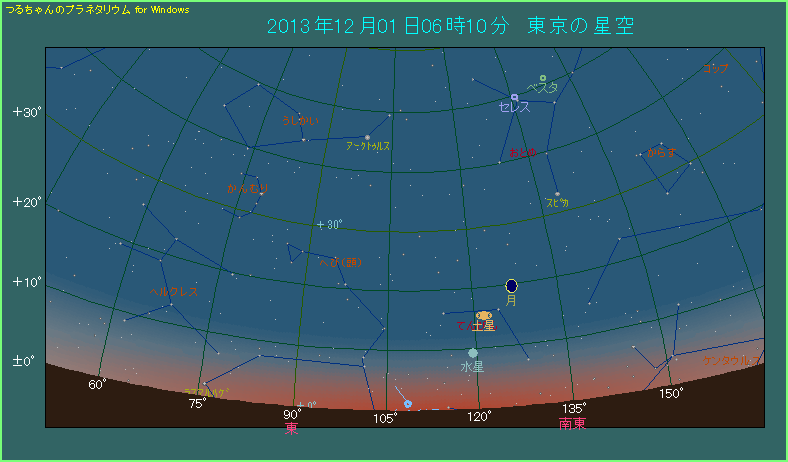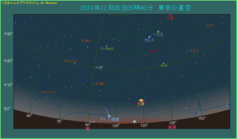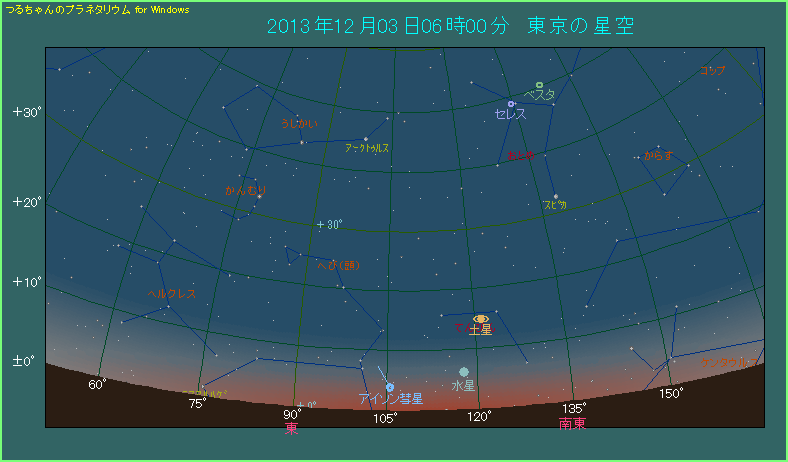 しかしながら明るさの方が3.3等とだいぶ暗くなってしまいました。薄明は5時3分から始まっており、すでに57分が経過。日の出は6時34分と、34分後にひかえています。厳しい条件であることに変わりはありません。この日も水星を目印にして、地平線付近を丹念にさがしましょう。もしかするとフワッと頼りない姿をしたアイソン彗星が見つかるかもしれません。