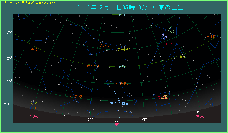 3日前、かんむり座のゲンマの真下に見えていたアイソン彗星は、かんむり座の左下まで位置を変えています。このところ動きが大きくなっているのは、12月27日に起こる地球との接近が近づいているからです。といっても明るさの方は、太陽からの距離が離れてきたため5.8等まで暗くなり、肉眼彗星とよばれるのもあとわずかです。クリスマスが近づく中、アイソン彗星を見送りましょう。