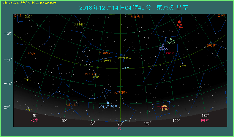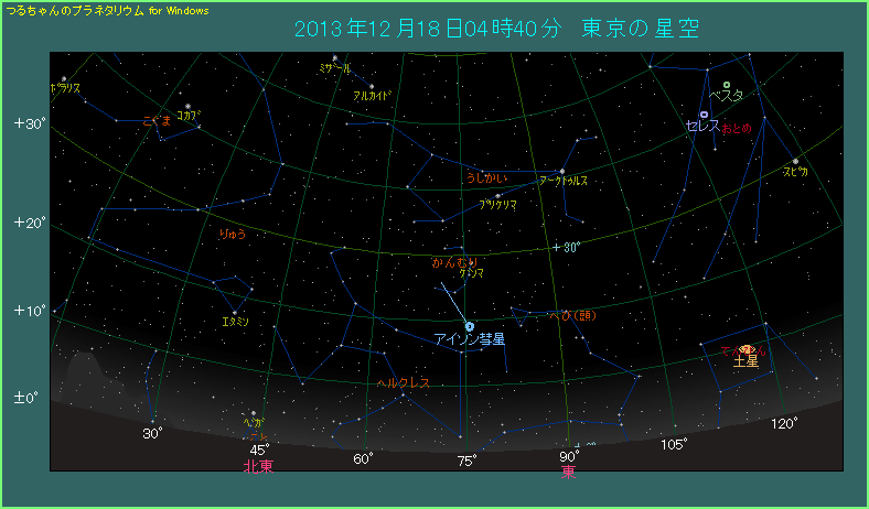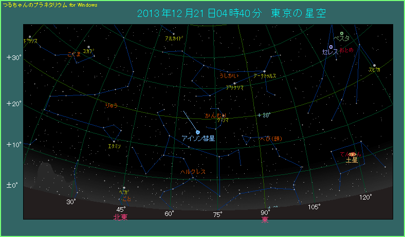 その後もアイソン彗星は太陽から遠ざかりつつあり、早くも金星軌道の近くまでやってきました。そのため見かけ上も太陽から離れてきて、高度が確実に上がっています。下の星図は4時40分と12月11日の場合よりも30分も早まりました。しかし高度は10.4度と、ほとんど変わりません。薄明が始まるのは5時11分ですし、月齢10.8の月も3時29分に沈みますから、完全に空が暗い状態で観測できます。明るさは5.3等ですから肉眼ではしんどいですが、双眼鏡の助けを借りれば、尾を長く伸ばしたアイソン彗星の姿が楽しめそうです。見え方は空の状態に大きく左右されますから、とにかく少しでも空が暗い場所から観測するようにしてください。