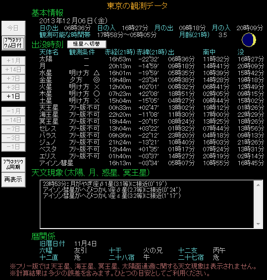 下部には天文現象欄があります。ここには、その日に起こる天文現象が、ソフトによって計算された結果が表示されます。12月6日の場合、アイソン彗星がへびつかい座の2つの星に相次いで近づくことがわかります。