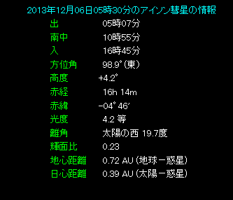 ところで、上記のプラネタリウム画面と同時に、下のような観測データ画面が表示されたことと思います。これを見ると、東京の日の出は6時36分であることや、アイソン彗星が昇ってくる時間は5時7分であることがわかります。また、観測可能な時間帯は17時58分から5時5分とありますが、これは暗夜で観測できる時間帯を示しています。ですからアイソン彗星は、空が明るくなり始めると同時に昇ってくることがわかります。