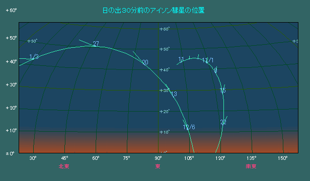 このように操作すると、下のような画面が表示されます。これは、日の出から30分前の時刻に、アイソン彗星がどの位置に見えるかを連続的に線で描いたものです。日の出から30分前ですから、当然空がだいぶ明るくなっています。11月末から12月初旬を除けばアイソン彗星の高度が高く、観測しやすいことがわかるでしょう。