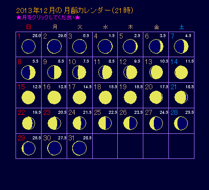 下のような月齢カレンダーが表示されことと思います。12月6日の場合は、月齢が3.5と表示されています。この日は夕方に見える三日月ですから、夜明け前に天体観測する場合は影響を受けません。同様に12月15日頃までは夜明け前に月がありませんから、観測に適しています。
