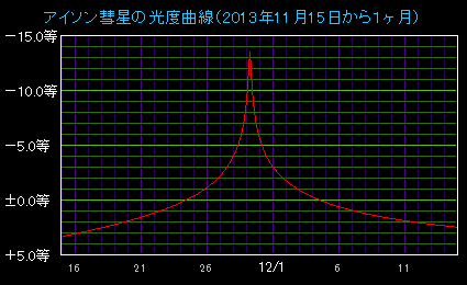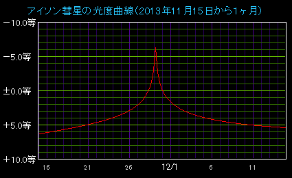 アイソン彗星の明るさは、当初の予報ではピーク時に満月クラスの-13等級まで明るくなるといわれていました。しかし、その後の観測で増光のペースが鈍っていることがわかりました。このため当初の予想どおり明るくならず、ピーク時の明るさは-6等級から-7等級止まりではないかと見られています。また、太陽から離れて実際に観測できる頃の明るさは、3等級から4等級にとどまりそうです。
