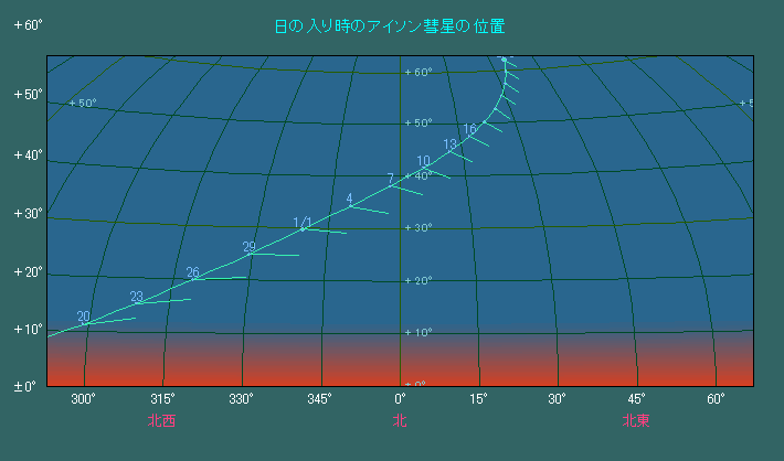 日の入り時刻、北の空に見えるアイソン彗星の位置(主に2014年1月)