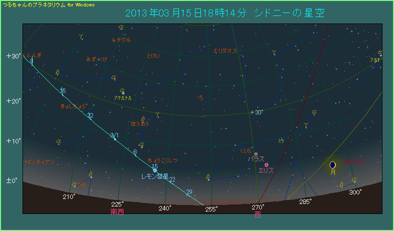 近日点通過前の3月15日、夕方を例に挙げてみましょう。下の星図はオーストラリアのシドニーから西南西の方向を眺めたものです。時差を考慮しておらず日本時間となっていますから、現地時間は1時間をプラスしてください。