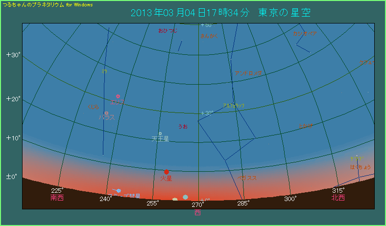 2013年3月4日は、東京くらいの緯度にある観測地において、日没時刻におけるパンスターズ彗星が高度が、はじめて0度を超える日です。3月4日の日の入り時刻は東京で17時39分ですが、この時刻における彗星の高度はわずか1.8度しかありません。いくらなんでもこの日に肉眼でパンスターズ彗星を見つけるのは難しいでしょう。