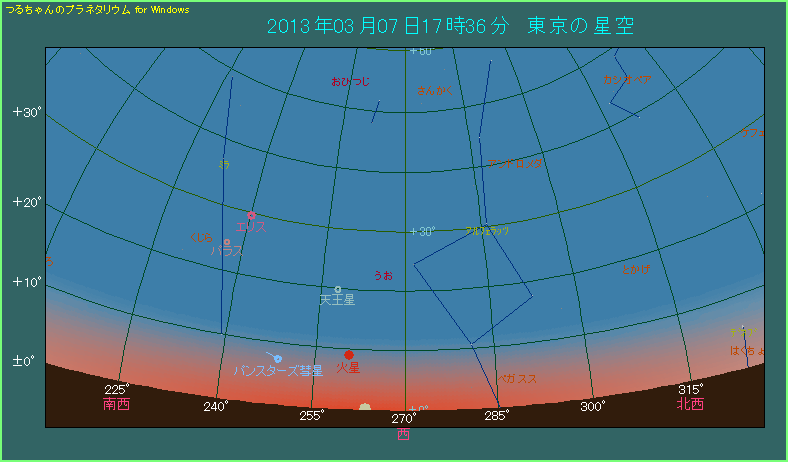 2013年3月7日になると西空で、パンスターズ彗星の高度が少し上がってきます。この日、東京で日の入り時刻における高度は6.5度ですから、4日の場合より4.7度も高くなりました。3日後に近日点通過をひかえているだけに、彗星の動きが速くなっており、1日たっただけでも位置が変わってきます。太陽へ近づくことで明るさの方も増してきており、3月7日は1.9等となっています。当初の予報よりも彗星が暗いため、実際に肉眼で見つけるのは難しいかもしれません。しかし、双眼鏡か天体望遠鏡を使えば、もしかするとこの日にはじめてパンスターズ彗星を見つけることができるかもしれません。
