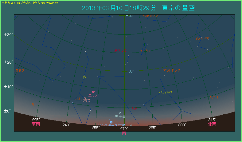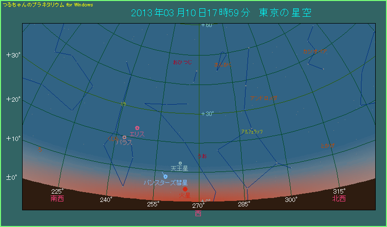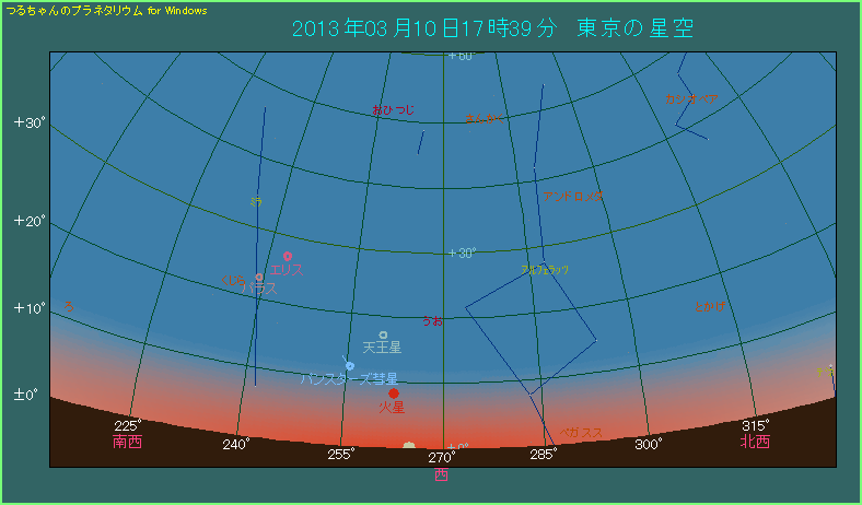 日の入りから30分が経過しました。ちょうど日暮れの頃で空は少し暗くなりましたが、パンスターズ彗星の高度が下がっています。そろそろ本格的に大気の影響を受け始めて彗星が見づらくなってきますから、このあたりでなんとか見つけておきたいところです。パンスターズ彗星の位置は真西から南へ9.1度、高度は5.1度です。もしそれらしい天体を見つけたら、尾が左から左上側に見えるはずですから確認してください。