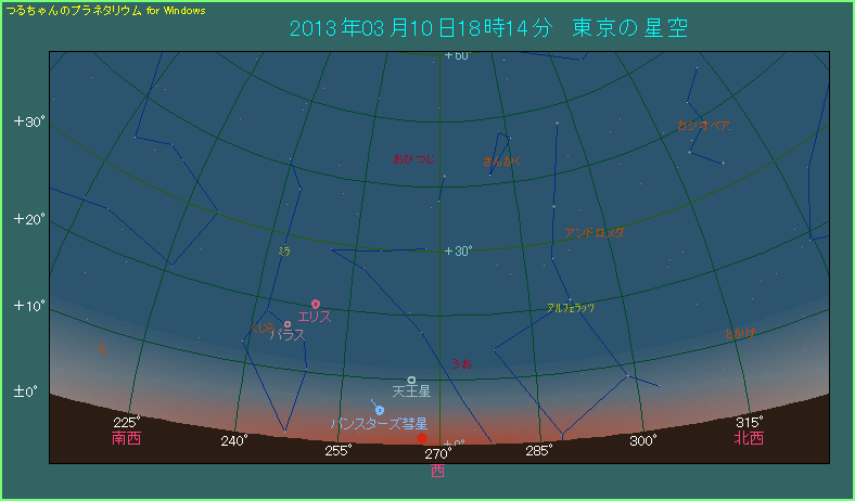 2013年3月10日はパンスターズ彗星が近日点通過する日です。太陽との距離は0.3015AUということで、水星軌道付近まで太陽に近づいていることになります。彗星の明るさは1.8等まで明るくなり、ピークに達しています。どこまで明るくなっているのか、パンスターズ彗星が実際に来てみないとわかりませんが、この頃に明るさがピークに達していることは間違いありません。当然ピークに達した彗星を、この目で見てみたいですね。