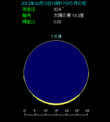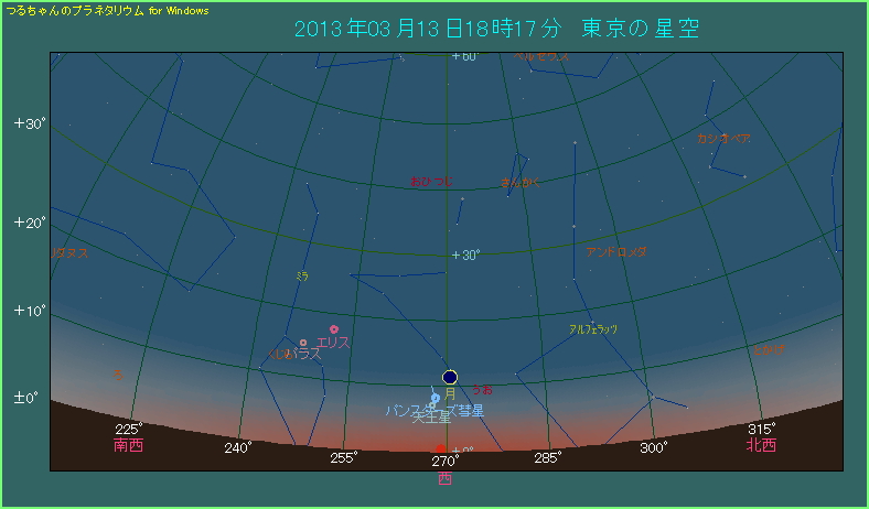 下の星図は3月13日の18時17分、日の入り時刻から30分が経過した西空のようすです。月齢は1.6という非常に細い月が真西の方向に見えています。これを目印にしてパンスターズ彗星を見つけましょう。