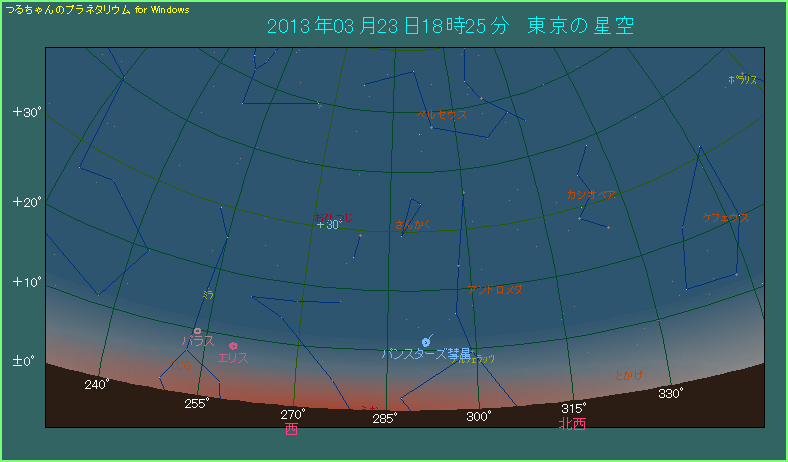 下の星図は3月23日の日の入りから30分後に見えるパンスターズ彗星の位置を示したものです。5日前と比べると明らかに北の方へ移動し、西というよりは西北西の空に見えています。明け方よりも明るさは0.1等落ちて、3.5等になっています。高度は11.3度ありますから、明け方よりはずいぶん見やすいでしょう。実際に観測される際は、時間の経過とともに彗星は右下の方向へ動いていきます。真下へ沈んでいくわけではありませんから注意してください。