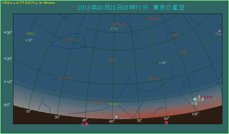 下の星図は3月23日、東京での日の出から30分前の東北東の空のようすです。パンスターズ彗星は3.4等の明るさですが、空も周囲もだいぶ明るくなって、彗星はかなり見づらい状態です。おまけに高度は1.4度しかないような超がつく低空です。さすがに小型の双眼鏡を使っても苦しいですから、大型の双眼鏡か天体望遠鏡を使って、低空を丹念に探してください。今のところ明け方のパンスターズ彗星は見づらいですが、この後は高度を一気に上げてきて、日増しに見やすくなってきます。